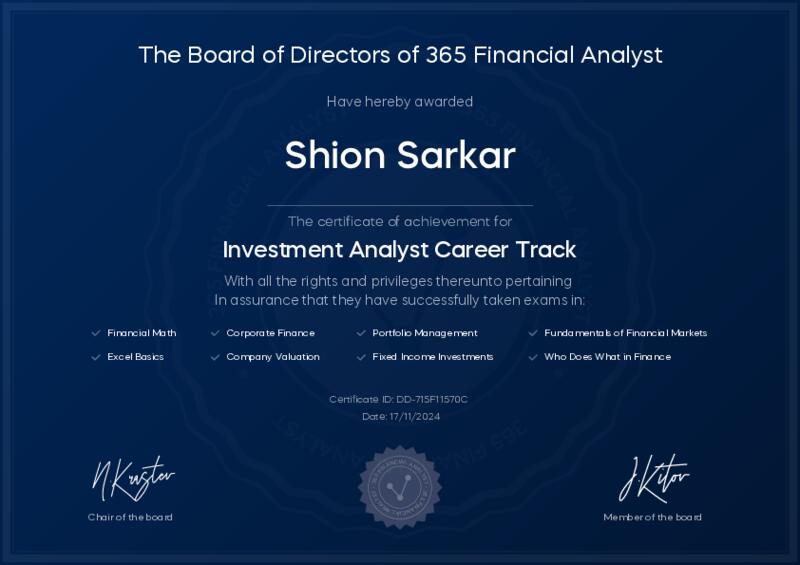This user has been awarded the Investment Analyst Career Track Certificate for successfully completing all courses and assessments. This certificate confirms their technical expertise and professional credibility to work as an investment analyst.